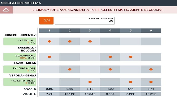 Ora suggeriamo due sistemi. Il primo sistema è nella forma 2/3 cioè basta indovinare una coppia di scommesse su tre totali. L’altro è nella forma 2/4 cioè bisogna indovinare almeno una coppia di giocate su quattro complessive. Il vantaggio dell’ultima formula è che si potrebbero anche indovinare tre partite o addirittura quattro su quattro e in questo scenario si sommano le vincite e si ottiene un incasso più elevato.