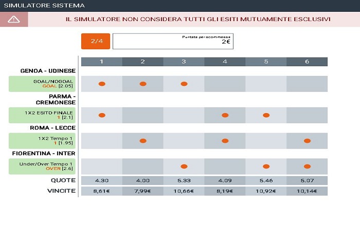 L’altro è un sistema 2/4, abbastanza simile a quello precedente perché funziona con le coppie di partite da beccare, aggiungendo però una quarta giocata (occorre centrare almeno due abbinamenti su quattro).