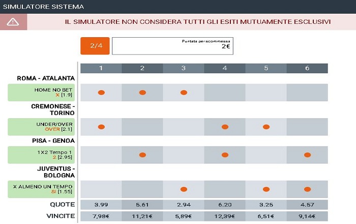 Per i sistemi scegliamo la formula 2/3 e quella 2/4. Vuol dire puntare sulle sulle coppie di partite. Si incassa se ne indoviniamo una di doppie oppure anche se le indoviniamo tutte. In questo caso la vincita è la somma delle doppie azzeccate. Ma vediamo meglio qui sotto come funzionano questi sistemi.