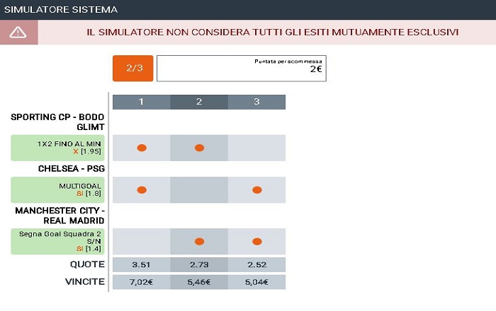 Suggeriamo anche due sistemi nella forma 2/3, ricordando prima come funzionano. Si tratta di tre partite inserite in un biglietto e si scommette su ciascuna delle tre. Poi basta indovinare una coppia di partite per incassare. Se invece le indoviniamo tutte e tre, l’incasso sarà la somma delle tre doppie azzeccate.